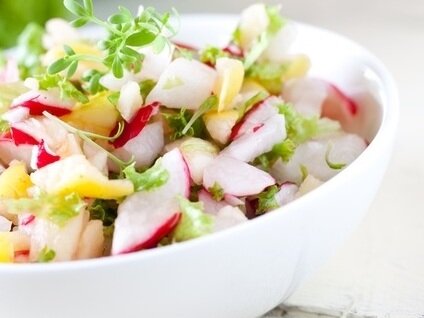 Даже тот салат, который приготовлен из минимального набора самых простых компонентов, может оказаться неожиданно вкусным. Так, к примеру, на даче из простых огородных ингредиентов приготовить можно замечательный, витаминный, хрустящий, нежный и очень ароматный салатик. Итак, для приготовления салата картофельного простого с редиской понадобятся такие компоненты, как: - черешковый сельдерей (одна штука); - сметана жирная домашняя (две ст. ложки); - клубни картофельные покрупнее (пять штук); - соус густой соевый (три ч. ложки); - куриное сырое отборное яйцо (четыре штуки); - горчица сладкая или зернистая (две ч. ложки); - зеленый лук стрелами (один пучок среднего размера); - майонез легкий без каких-то дополнительных добавок (три ст. ложки); - соль морская мелкого помола или каменная (на свое усмотрение); - редиска молодая среднего размера (двенадцать штук); - свежие огурчики небольшого размера (две штуки). Куриные яйца и всю промытую картошку до готовности отварить, далее