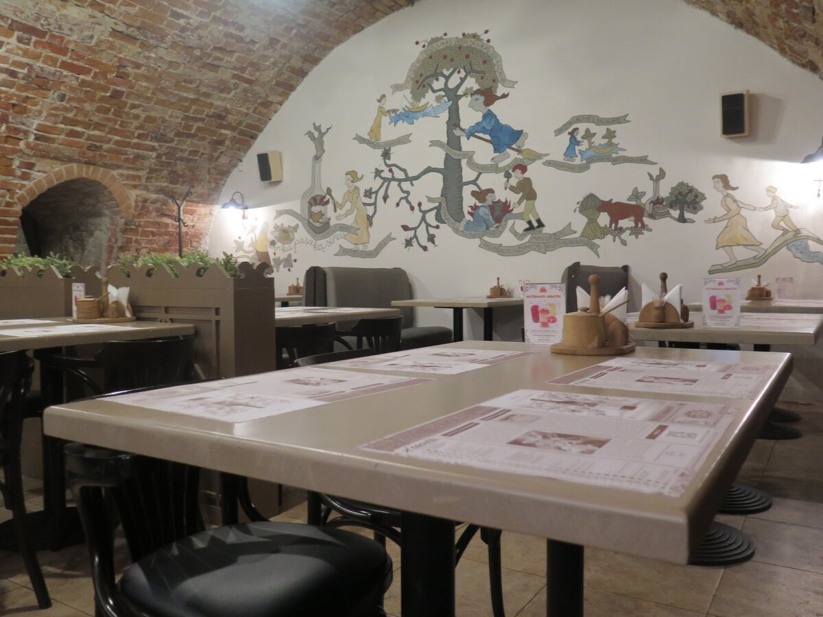 Forto Dvaras - ресторан национальной литовской кухни, расположенный в каждом большом городе Литвы. В этот раз мы были в Каунасе Интерьер ресторана выполнен в традиционном стиле – внутри очень аутентично, еда в ресторане вкусная и всегда большие порции. Расположен ресторан в самом центре старого города Каунаса, на Ратушной площади Кроме традиционных литовских блюд в ресторане можно попробовать разные сорта литовского пива. В меню есть цеппелины 14 видов, суп в хлебе, десерт в черном хлебе, кровяная колбаса, свиные уши, жаренный сыр. И еще много разных вкусных блюд. Немного устав от цеппелинов я выбрала в этот день картофельные «ведарай» - национальное литовское блюдо: свиные кишки, набитые сырым тёртым картофелем и запечённые в духовке. Подают его со сметаной и шкварками. Крокодил изучает интерьер