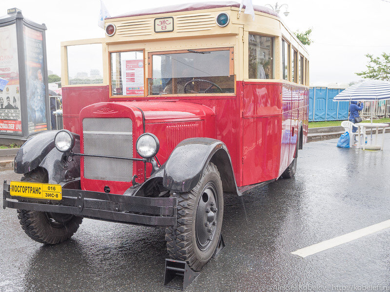 ЗИС-8. Выпускался на удлиненной с 3,81 од 4,42 м базе ЗИС-5. Число сидячих мест – 22, общее количество мест – 29. Рядный шестицилиндровый двигатель объемом 5,55 литра выдавал 73 л.с. и разгонял этот шеститонный автобус до 60 км/ч. Годы выпуска 1934-1936. Настоящая музейная редкость