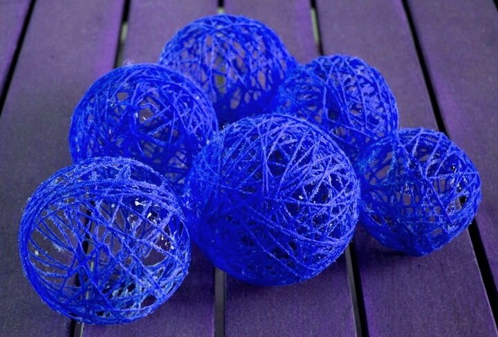Полые шары из ниток смотрятся необычно и очень красиво. Сегодня мы расскажем вам, как их сделать, и предложим несколько идей по изготовлению новогодних аксессуаров с использованием такого украшения. Шары из ниток можно использовать как самостоятельное украшение для елки, превратить их в сверкающую гирлянду, соорудить из них новогоднего персонажа и многое другое. Так что вооружайтесь нитками, а дальше за вас все сделает ваша фантазия. Что нам понадобится? Ход работы Ранее мы рассказывали вам, как делать абажур из ниток. Техника изготовления этих шаров будет похожей. Главное отличие в том, что надувать шарики слишком сильно не нужно. Сделайте их совсем небольшими – размером с кулак. Надуйте столько шариков, сколько нужно. И подвяжите их где-нибудь, чтобы обматывать и сушить будущую поделку было удобно. В миске разведите полтора стакана клея с половиной стакана крахмала и четвертью стакана воды. Нитку обмакиваем в миску и наматываем на шарик в произвольном порядке. Предварительно воздушны