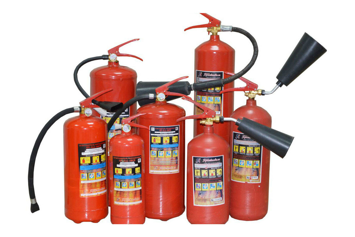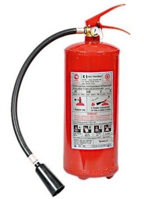Самые дешёвые и поэтому распространённые огнетушители - порошковые ОП. Они тушат выбрасываемым под давлением порошком, и после тушения всё оказывается в этом самом порошке. Обычно порошковый огнетушитель выглядит так.
