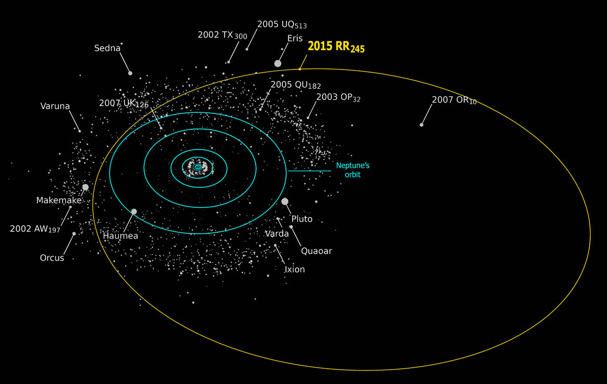 Далеко за орбитой Нептуна, в поясе Койпера, обнаружена новая карликовая планета Солнечной системы. 2015 RR245 – шар из льда и камня – была замечена на серии снимков, сделанных в сентябре 2015 года астрономами гавайской обсерватории Мауна Кеа в ходе работы по программе OSSOS (Outer Solar System Origins Survey). Планета движется по сильно вытянутой орбите, полный оборот по которой совершает примерно за 700 земных лет. В настоящий момент расстояние от нас до 2015 RR245 составляет порядка 9 млрд км, и сблизится с Землей она лишь в 2096 году, когда дистанция от 2015 RR245 до Солнца уменьшится до 5 млрд км. Судя по имеющимся данным, температура на поверхности планеты достигает –220 °C и она покрыта смесью водного льда и замерзшего азота. Пока что карликовая планета остается под временным индексом, однако вскоре у нее может появиться и официальное название.