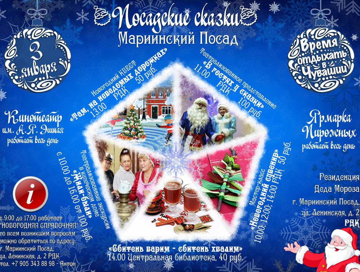 До Нового года осталось две недели. Предлагаем несколько вариантов путешествий для тех, кто не хочет провести праздники лежа на диване. 3 января 2018 года будет дан старт череде самых интересных мероприятий этой зимы в Чувашии – для всех желающих начнется «Новогоднее путешествие по Чувашии» – квест, который охватывает территории 5 муниципальных образований республики. Маршрут «Новогоднего путешествия по Чувашии» в 2018 году будет проходить через город Мариинский Посад (3 января), Чебоксарский район (4 января), город Новочебоксарск (5 января), Моргаушский район (6 января) и город Алатырь (7 января). 3 января 2018 г., Мариинский Посад Вас ждет увлекательное путешествие в старинный купеческий город, где у каждого дома есть своя легенда или небылица. Каждый сможет принять участие в мастер-классе по изготовлению новогоднего сувенира, театрализованном представлении, новогоднем квесте! 4 января 2018 г., Кугеси В Чебоксарском районе гости смогут не только провести свой досуг, но и позаботи