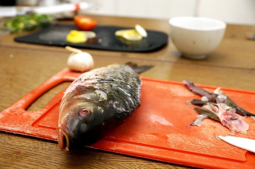 Я, наверное, не буду рассказывать о том, как я все это чистила. Весело. Вообще, мне даже понравилось в какой-то мере. Особенно сазанов. Их нужно засунуть в пакет, в пакет же засунуть руку и нож. И постараться почистить ножом сазана. А не сазаном руку, рукой нож или ножом руку. Иначе, если приоткрыть пакет, гигантской крупной чешуей покрывается сначала стол, потом твои брови, потом люстра.