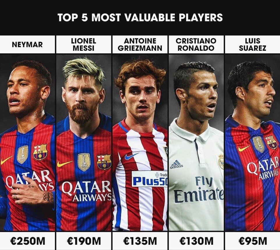 1. Neymar JR €250млн в настоящее время выступает за Paris Saint-Germain (Париж Сен-Жермен) 2. Leonel Messi €190млн в настоящее время выступает за FCBarcelona (Барселона) 3. Antoine Griezmann €135млн в настоящее выступает за Atlético de Madrid(Атлетико Мадрид) 4. Cristiano Ronaldo €130млн в настоящее выступает за Real Madrid(Реал Мадрид) 5. Luis Suarez €95млн в настоящее время выступает за FCBarcelona (Барселона)