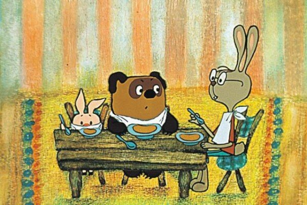 И не про сгущёнку и мёд вопрошал кролик собратьев по бодуну. Этот диалог звучал так: «Винни, тебе водки или пива?» «И того и другого и можно без закуски!» Обратите внимание на эту троицу за столом. Она вам никого не напоминает? Сходство почти портретное. Очкастый интеллигент – датчанин-кролик. Трусливый потаскун – поросёнок-Басилашвили. Не говоря уже про Винн