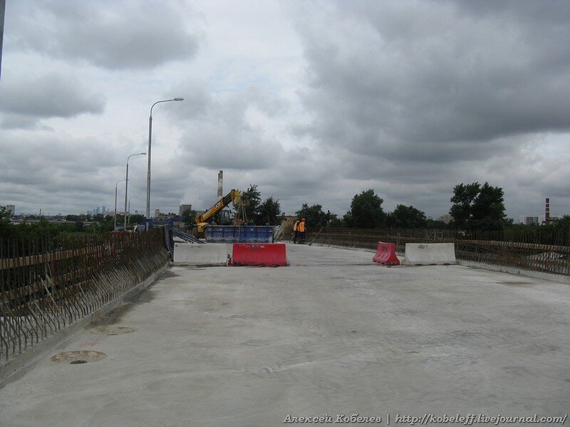 Теоретически, по эстакаде уже можно ездить, но нет отбойников и нет нормального дорожного полотна. Есть только пролеты над ж/д путями и арматура, вокруг которой зальют отбойники.