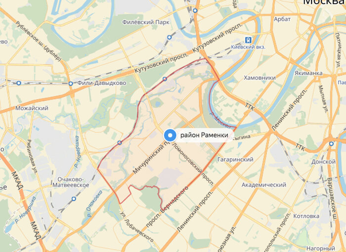 Граница района с севера проходит вдоль Третьего транспортного кольца и набережной Москва-реки, с юга вдоль парка им. 50-летия Октября и ул. Лобачевского, с запада по колее Киевского направления МЖД, с востока вдоль Проспекта Вернадского.