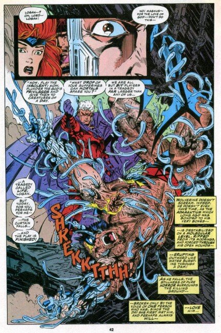 Ну да, ну да, такие заголовки очень любит желтая пресса. Но, поверьте, он оправдан. В комиксах постоянно происходят важные события. Интриги, скандалы и мордобой нон-стоп — за это, собственно, мы и любим их. Однако время от времени случается такое, после чего ты еще многие годы можешь ходить под впечатлением. Например, смерть Гвен Стейси. Читайте первую часть большого спецматериала, посвященного самым шокирующим моментам в истории комиксов Marvel и DC. Магнето выдирает адамантий из тела Росомахи Магнето выдирает адамантий из тела РосомахиВы наверняка знаете, что скелет старины Логана покрыт адамантием, неразрушимым металлическим сплавом. И, наверное, также слышали, что суперзлодей Магнето имеет неограниченную власть над металлом. Когда Росомаха и Магнето сошлись в смертельной битве в X-Men #25, Магнето попросту выдрал весь адамантий из тела своего противника. О, это было больно! Росомаха едва не умер от шока. Он выжил лишь благодаря своей невероятной способности к регенерации, но и то д