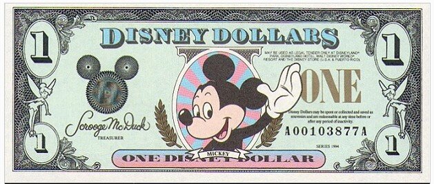 Мало кто знает, но существуют весьма интересные деньги, так называемые «диснеевские доллары». Они выполнены по стилю как привычные доллары США, только вместо портретов американских президентов, на них изображены герои мультфильмов Диснея. И это не подделка. Эти доллары реально существуют. Их курс равен официальны долларам США. Только расплатиться этими деньгами можно лишь в Диснейлендах мира, а также на различных круизных кораблях и курортах, организованных Диснеем. Выпущено несколько номиналов – 1, 5, 10 и 50 долларов. Их можно купить в тематических парках Диснея, а также в различных магазинах для коллекционеров. Особенной популярностью у коллекционеров пользуются юбилейные банкноты. В 2028 году будет столетний юбилей диснеевских мультфильмов. Наверняка к этой дате будет выпущена специальная серия банкнот. Между прочим, стоимость некоторых экземпляров превышает их номинальную стоимость. Вот эта одна из самых красивых: