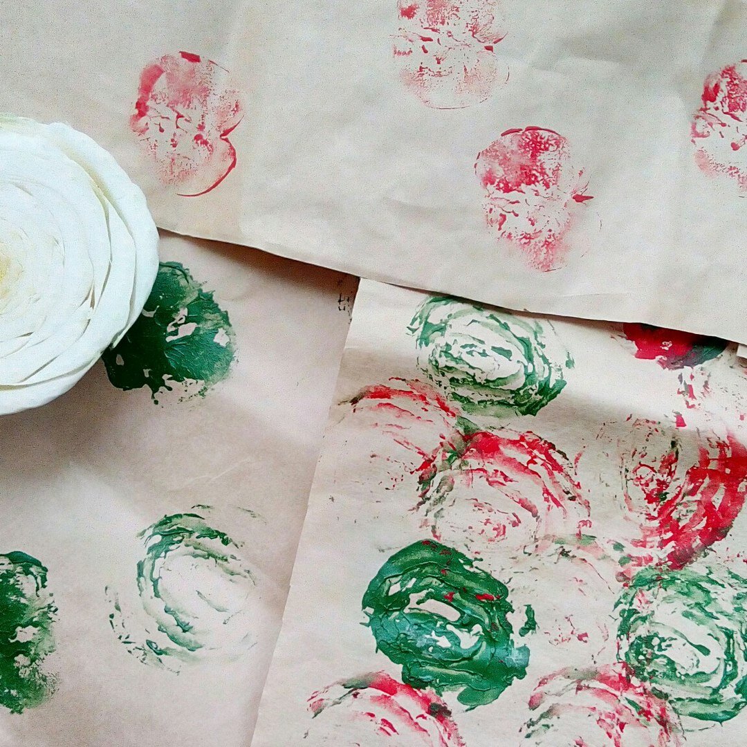 Мы с Тасей наштамповали упаковочную бумагу для подарков)) В качестве основы у нас листы крафт бумаги - разрезанный бумажный мешок из Мегастроя) Краска акриловая. Штампы в этот раз - это обрезанный кочан пекинской капусты и разрезанное яблоко. Быстро, легко и весело - главное успеть вовремя остановить ребенка. А то все штампы сольются в единый непонятный рисунок.