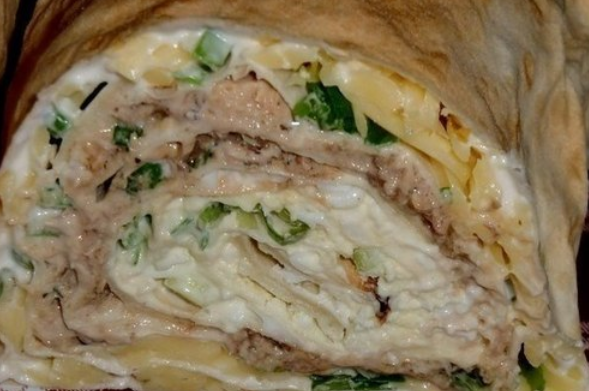 Отличная закуска в тихий зимний вечер, а также на праздничное застолье. Начинка может быть разной, но мы предлагаем свой вариант, сочный, аппетитный и очень вкусный! Ингредиенты 3 тонких лаваша 200 гр. твердого сыра 4 яйца 1 банка консервированной сайры с собственном соку Майонез 2 зубчика чеснока Зеленый лук и укроп Соль и черный молотый перец по вкусу Приготовление Яйца отвариваем и натираем на крупной терке, зелень нарезаем мелко и половину порции смешиваем с яйцами и постелив лаваш на стол, а затем полив его майонезной сеточкой, равномерно выкладываем на лаваш. Следующий лаваш кладем рядом с первым и смазываем его натертым сыром смешанным с майонезом, зеленью и выжатым через пресс чесноком. На третий лаваш, политый сеточкой майонеза, выкладываем размятую вилкой рыбу. Начинаем сворачивать с первого лаваша, закрутив его полностью, присоединяем второй, а затем и третий лаваш. Заворачиваем рулет в пленку либо фольгу и оправляем на час в холодильник. Аккуратно, острым ножом нареза