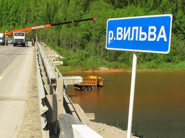 Когда много путешествуешь на машине, зачастую становишься свидетелем различным причудливых аварий, что характерно со счастливым концом. Однажды летним июньским утром на мосту через Вильву трассы Чусовой-Березники мы застали вот такую картину. Сначала я решил, что самосвал поехал по руслу реки, чтобы подсыпать гравием подмытые быки моста, и застрял. Но когда обошел с другой стороны, стало ясно, что дело могло закончиться большой трагедией. Потерявшая управление машина китайского производства shacman (?) буквально прыгнула с моста в русло реки. Каким-то чудом все остались живы. Причина чисто техническая, помноженная на человеческий фактор. Все дело в том, что у этих самосвалов тормоза не доработаны. На длинных спусках они замыливаются и машина теряет управление. Самосвал спускался в долину Вильвы и перестал реагировать на педаль тормоза. В результате на последнем повороте перед мостом выехал на полосу встречного движения и врезался в бетонные отбойники. Затем снес металлический отбойн