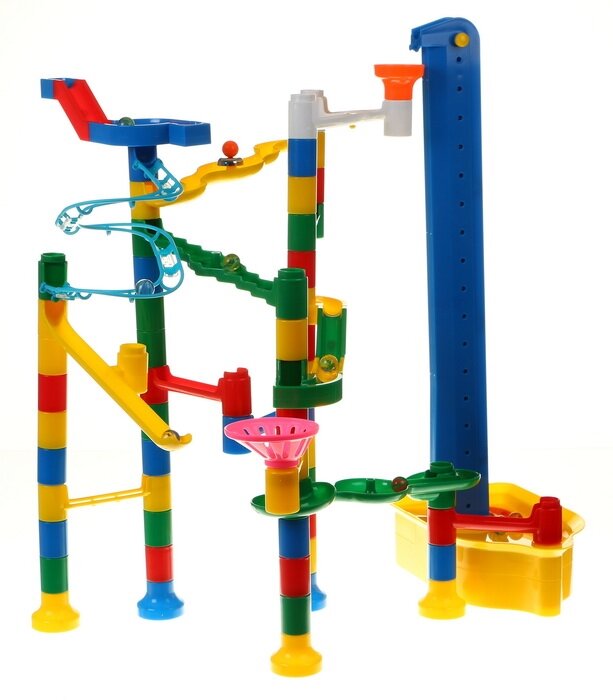 … Можно собрать горку с двумя входами и одним выходом, с одними входом и выходом, с двумя входами и выходами. В этом случае с появлением второго ребенка стало прикольно пускать шарики по двум трекам наперегонки ))) ….