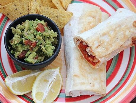 Разложите лепешку на столе, на середину выложите сыр, на него начинку. Плотно заверните.