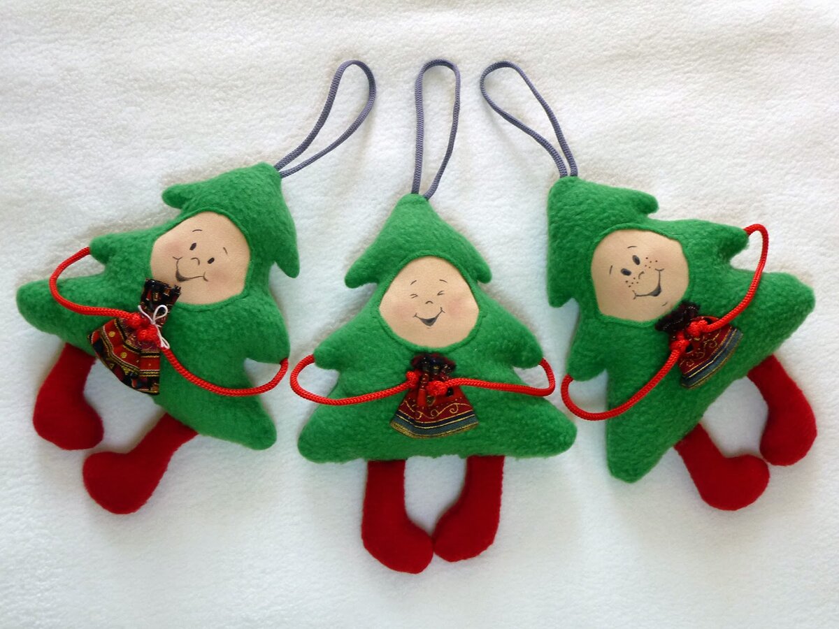 Представляю Вашему вниманию мастер-класс по шитью вот таких забавных елочек. Ими можно украсить праздничный интерьер или подарить друзьям и знакомым. Игрушка ростом 18 см вместе с ножками. Нам понадобятся: Распечатываем выкройку, вырезаем детали. Центральную часть детали самой елочки тоже вырезаем. Вырезаем основные детали из зеленого флиса, припуск оставляем побольше, чтобы потом удобнее было закреплять шнурки.. На одной из деталей делаем надрез на том месте, где будет личико, чтобы потом легче было вырезать. С изнаночной стороны на эту деталь накладываем ткань для лица изнаночной стороной вверх. Под этим квадратиком как раз маленькая прорезь. Прошиваем по контуру личико полностью. Отрезаем лишнее. Сейчас мы видим изнаночную сторону передней части елки. А теперь переворачиваем на лицевую сторону и через оставленное нами отверстие вырезаем основную ткань по контуру личика, оставляя 1-2 мм. Получается обратная аппликация. Рисуем акриловыми красками личико, делаем щечки румянами. ))