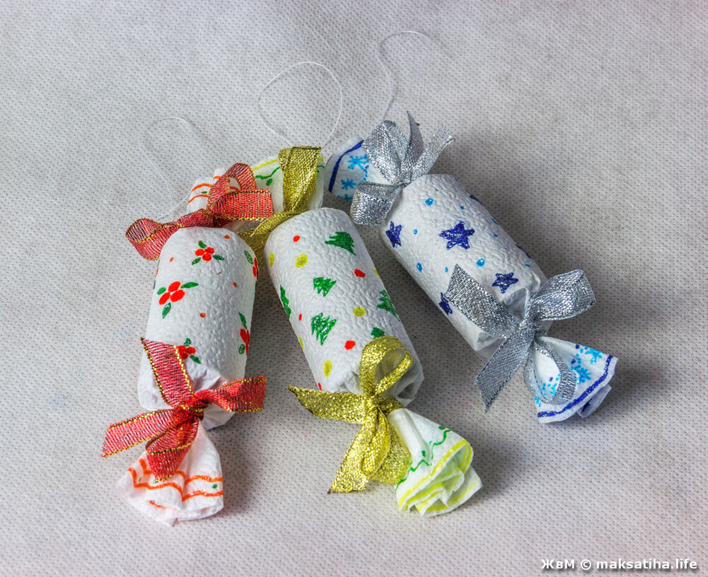 Так получилось, что я оказался в деревне надолго, скорее навсегда. Если в старые советские времена в нашей семье всегда был большой ящик с новогодними украшениями и игрушками, то здесь в деревне я не имел возможности богато украшать комнаты к Новому Году. Что делать? Создавать украшения своими руками, точнее руками моей девушки Анжелы. И начали с самого простого - новогодние конфеты из подручных средств. Анжела сказала, что этому их обучали еще в школе, а я не помню такого на своих уроках труда. Для основы возьмем бумажную втулку, например от фольги для запекания. Втулку можно использовать такую, какую найдете. Размер будущих украшений зависит от вашей фантазии. Понадобятся нитки, ножницы, клей-карандаш, всякие разные яркие ленточки для завязок. Анжела занимается рукоделием и такой ерундовины у нее много в закромах. Про салфетки (или бумагу)... будет хорошо, если есть салфетки с новогодними рисунками. Если нет таких - берем чистые и белые, сами разукрасим, гелевыми ручками, можно с