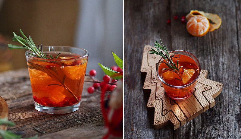Все просто - сок с сахаром прогреть в сотейнике пока сахар не растворится. Остудить. Перелить сироп в кувшин, добавить дольки мандарин разрезанные пополам и слегка раздавленные, зерна граната, влить вино и ром, перемешать. Добавить веточки розмарина , еще раз перемешать и отправить в холодильник на пару часов.