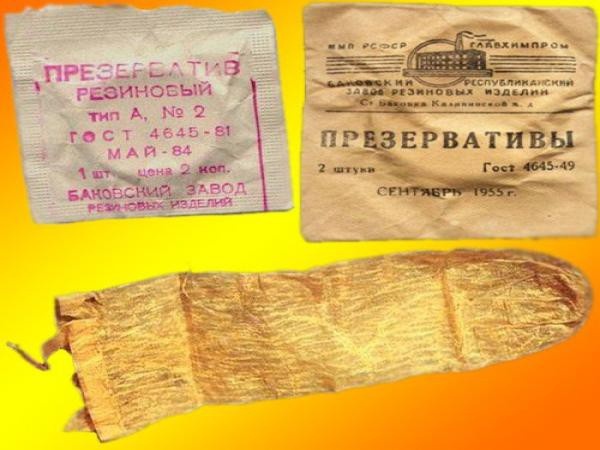 - А вы не против, если я подожду здесь пока кто-нибудь не купит?... (Народный фольклор) Как это ни странно, такая деликатная вещь, как «типоразмер» учитывалась и в советское время. Всего их было три: № 1 — «наименьший», № 2 — «средний», № 3 — «большой». Но поскольку 1-й и 3-й номера пользовались гораздо меньшим спросом (большинство «пользователей» и не догадывалось, что у презервативов бывают размеры), в продаже, как правило, был только 2-й. По сегодняшним меркам, советские презервативы образца 49-го были грубыми - толщина их стенок составляла 0,09 мм, что несомненно снижало удовольствие от их применения. Те, у кого были связи и позволяли средства, пользовались итальянскими, ввезёнными в СССР через ГДР, Югославию или братскую Индию. Современные контрацептивы имеют толщину до 0,04 мм - ибо латекс. Зато толстый резиновый кондом мог выдержать нагрузку в 200 кг / см2 - или ведро дистиллированной воды (только одно, не пытайтесь налить второе!). По неподтверждённым данным, к середине