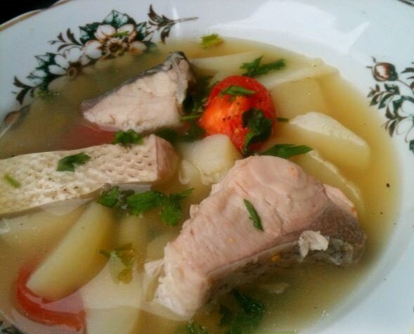 Самое сложное, что вам придется сделать для приготовления этого блюда из толстолобика - выпотрошить и очистить рыбу. После этого можете считать, что дело в шляпе - осталось просто все по очереди опустить в кипящий бульон.Рыбный бульон можно заранее сварить из мелкой рыбы или рыбных голов, хвостов и плавников. Продукты (на 4 порции) Толстолобик - 350 г Картофель - 3-4 шт. Помидоры - 2-3 шт. Вода - 1-1,5 л или Рыбный бульон - 1-1,5 л Тимьян сушеный - 0,25 ч. ложки Соль - 1 ч. ложка Перец черный молотый - 1-2 щепотки Пошаговый фото рецептУха из толстолобика Подготавливают продукты для ухи из толстолобика. Как варить уху из толстолобика с помидорами: