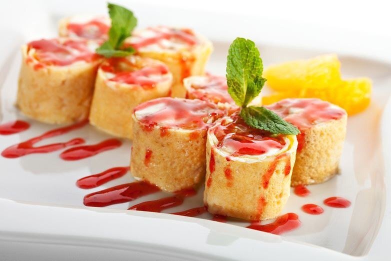Сладкие блинные роллы с творожно-фруктовой начинкой.