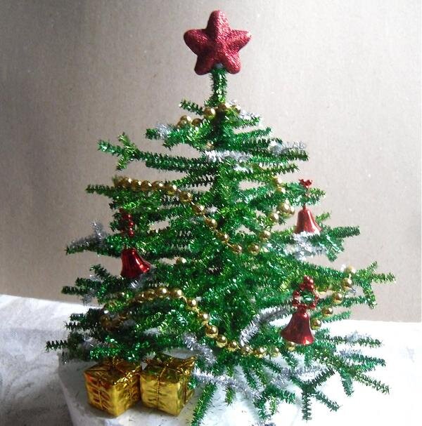 Начнем с елки из мишуры: материал недорогой, работа несложная, времени занимает немного, а результат — превосходный!