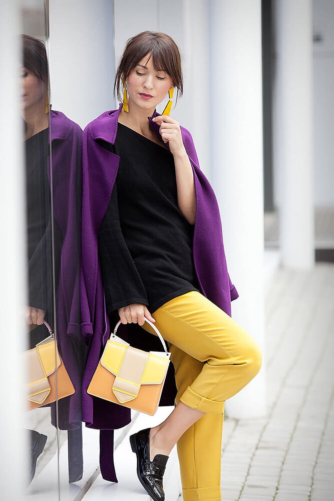 На самом деле все не так страшно и зависит от цветов компаньонов. Одни способны подчеркнуть его яркость, другие делают сдержанным и благородным. Желтый цвет оживляет весь образ. Сдержанный образ всегда можно разбавить контрастным аксессуаром. Ниже на фото отлично вписалась сумка оранжевого цвета. Очень дерзко и ярко смотрится сочетание фиолетового с красным. Сочно, ярко с бирюзовым и сине-зеленым оттенками. Если вы предпочитаете более спокойниые оттенки, то смело разбавляйте фиолетовый серыми и бежевыми цветами Белый — это всегда беспроигрышный и классический вариант в сочетании с любым цветом и фиолет не исключение. Бледный зеленый, оливковый цвета помогут образу выглядеть свежим и не слишком ярким. Светло - голубые и бирюзовые оттенки очень элегантно, не правда ли?