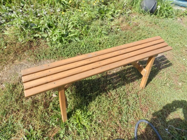 Садовая скамья своими рукамиТакую скамью можно сделать буквально на коленках, имея в арсенале только циркулярку и электрорубанок. Для сборки простые саморезы разных размеров и шуруповёрт. Конструкция, как видите, простая и очень надёжная. Их можно составить рядом и получается кровать или же стол. Чертежей не было, но есть ещё несколько фотографий, что бы было понятно как делать