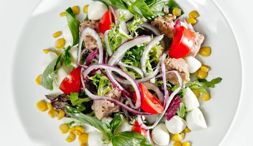 Блюдо для праздничного стола. Ингредиенты: Тунец консервированный 240 грамм Сыр фета 150 грамм Яйца перепелиные 6 шт. Кукуруза консервированная 400 грамм Помидоры черри 6 шт. Огурец 1 шт. Масло оливковое 1 столовая ложка Салат 2-3 листа Зелень 1 пучок Соль, перец по вкусу. Приготовление: Достать из банки консервированный тунец и немного раздавить вилкой. Перепелиные яйца отварить. Отварные яйца разрезать на половинки. Сыр фета нарезать небольшими кубиками. Помидоры и огурцы нарезать крупными кусочками. Зелень нарвать руками на крупные куски. Выложить листья салата в 2-3 порционные посудинки. Сверху выложить все подготовленные ингредиенты: тунец, кукурузу, яйца, сыр фета, овощи, зелень. Из консервированной кукурузы предварительно вылить сок. Салат посолить, поперчить по вкусу, заправить оливковым маслом. Приятного аппетита.