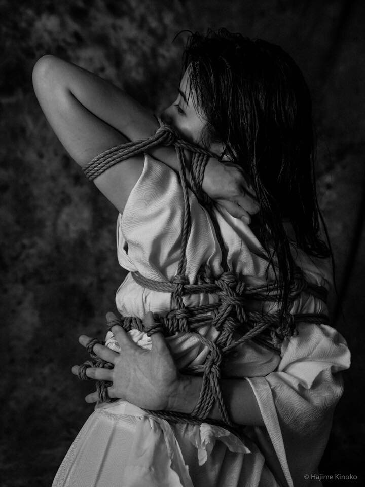 Частый вопрос: есть ли разница между шибари и кинбаку. Ответ: это одно и то же, если мы говорим о веревочном бондаже. Но есть нюансы. Шибари - для японца это любое связывание или ограничение. Т.е. завязать шнурки или упаковать подарок - это тоже шибари. Если вы не можете что то делать (ограничены), то и это шибари. И здесь связывание человека человеком - это лишь один частный случай. Кинбаку же - это термин означающий только и только веревочный бондаж, более того именно в контексте СМ игры. Т.е. такие разделы шибари, как эстетический бондаж, арт бондаж, эротическое макраме и т.п. не будут отнесены к кинбаку. Кинбаку - достаточно молодой термин, не так давно появившийся в Японии. Необходимость в нем возникла потому, что шибари стало самостоятельным и популярным явлением, потребовавшим самостоятельного именования. Т.е. шибари и кинбаку это равноправные названия одного и того же: веревочного бондажа в японском стиле, только кинбаку - более узкий термин. Фото бондажа Kinoko Hajime Это шиб