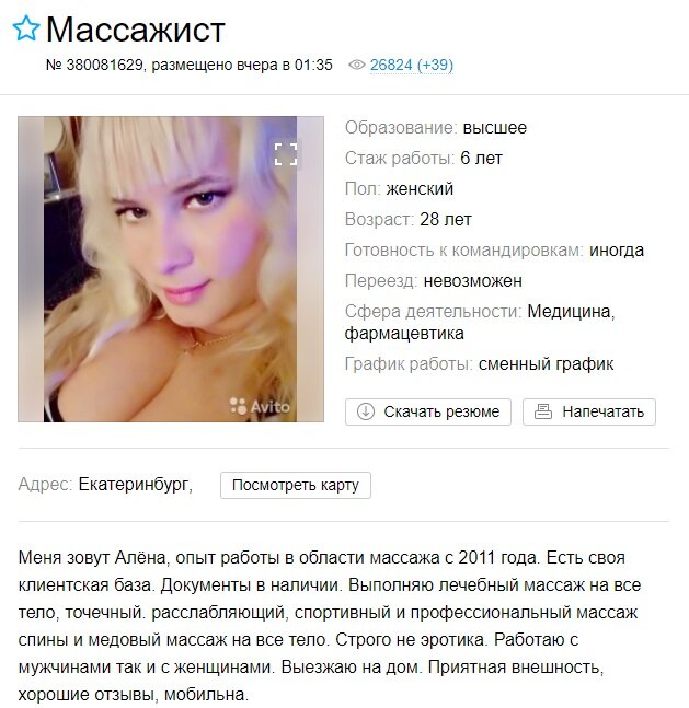 Наш канал публикует всегда свежие, актуальные, сочные резюме со всей России, которые проходят жесткий отбор, перед тем, как попасть к вам в ленту! Наконец - то публикуем подборку красивых девушек в белых халатах с Авито - все они в данный момент ищут работу. Возможно, именно поэтому они прикладывают такие интересные фото, смотрим: 1) Екатеринбург, массаж, выезд на дом: Кандидат указывает "Строго не эротика" - для чего тогда такие фото? Непонятно... 2) Также массажистка из Краснодара: Еще фото из галереи на сайте: 3) Просто красивая девушка из Уфы: 4) И обещанные глаза: Неплохо увидеть такое лицо при выходе из запоя, не поспоришь! Тем более анонимно, и такие прекрасные глаза! Можно и вообще бросить пить Подписывайтесь на канал, если понравилась публикация, смотрите другие публикации, например, вот о претендентах с самыми высокими запросами по зарплате!
