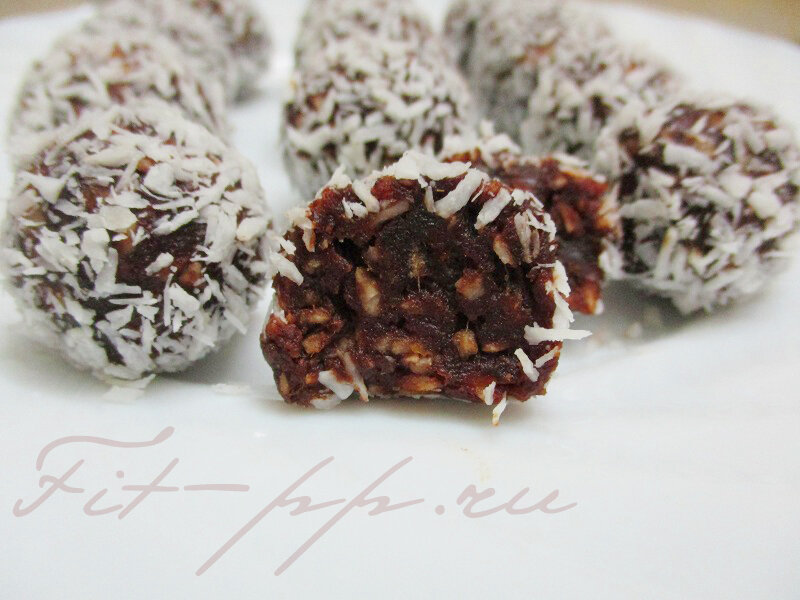 КБЖУ: 407/8,2/21,1/48,4 Название смешное, правда? А, на самом деле, оно просто подчеркивает наличие некоторых ингредиентов в этом рецепте. Конечно, это сладкие-пресладкие финики и вкусный-превкусный шоколад (точнее - какао)... Начнем! Ингредиенты: Финики - 150 гр. Кокосовая стружка - 50 гр. Какао - 20 гр. Приготовление: 1. Подготовьте финики. Помойте, удалите косточки и поместите в сито или дуршлаг. Установите его над кастрюлькой с кипящей водой. Сверху прикройте финики крышкой. Получится импровизированная паровая баня. Через несколько минут финики станут мягкими - они готовы к измельчению. 2. Прокрутите плоды через мясорубку или пробейте блендером. 3. Добавьте кокосовую стружку (оставив немного для декора). 4. Введите какао и перемешайте. 5. Влажными руками сформуйте конфетки и обваляйте их в стружке. 6. Уберите лакомство в холодильник на 1 час. Вот и все! "Фини-шоко" готовы! Они очень сладкие и сытные. Буквально одной-двух конфеток вполне хватит для чаепития. Больше рецептов пп-вку