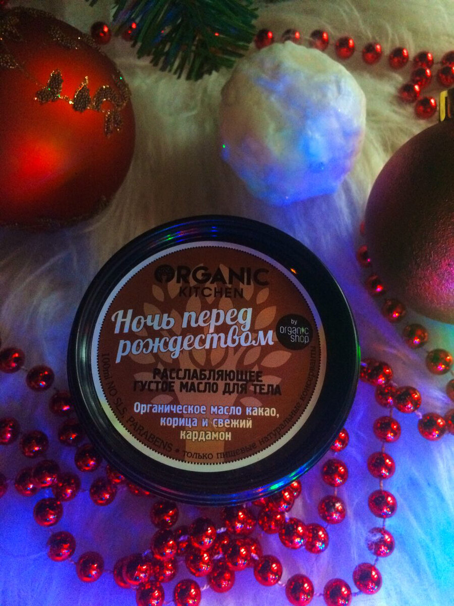 Organic Kitchen | Ночь перед Рождеством Я заметила, что я либо совсем не выкладываю обзоры на средства, либо выкладываю разом, надо исправляться. Но не сейчас... Прежде всего, продукт называет себя маслом для тела, и доля правды в этом есть: по виду и первым ощущениям, особенно по виду, консистенция напоминает растопленное сливочное масло. Но сравнивая его с тем же маслом от Lush, Ночь перед Рождеством мне больше напоминает кремообразный мусс, с легкой и шелковистой текстурой при нанесении. Что касается его полезных свойств, то похвалиться ахриненным питанием и увлажнением своей кожи я не могу. Грубо говоря, помазал и тут два ответвления: либо я жду часик и от масло не остается даже следа, либо случайно мою руки и оно также исчезает. Из приятных моментов - запах следующего формата, как сказал мой мужчина, "Тебя хочется съесть", это прикольно. Не прикольно, что запах держится от силы 10 минут, а дальше любимый фокус с исчезновением. Вжух! Почему же оно бесполезно? Ну, потому что к м