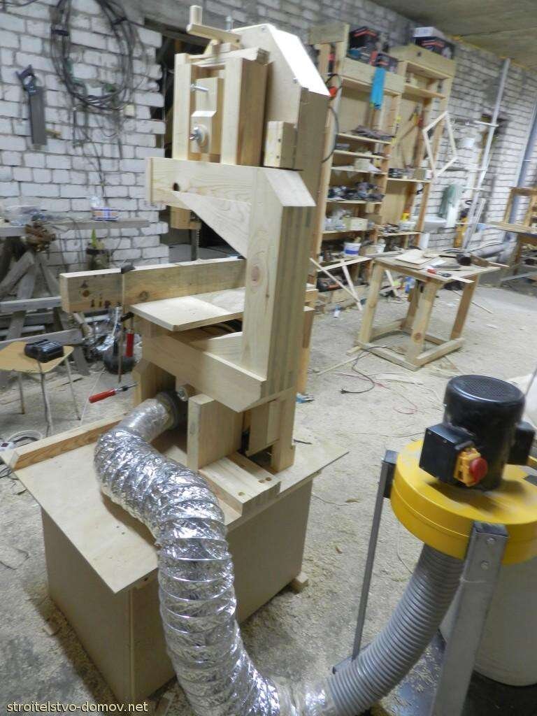 Изготовление ленточной пилы по черетежам заняло у нас пару недель. Можно быстрее,если использовать быстросохнущий клей и купить необходимые материалы инструметы заранее. Например, нужно очень много струбцин. Материалы: клеёная сосна, берёза и берёзовая фанера. Купить пришлось двигатель на 380 вольт, гору болтов и гаек, подшипники и полотно пилы. Сложностей в изготовлении никаких, если всё делать по чертежам. Предвариельная сборка рамы ленточной пилы С чертежами, конечно приходилось поразбираться, но в целом оказалос все понятно. Главное сделать всю деталировку и отметить детали соотвественно. В раму сгодились все обрезки с сучками и прочими недостатками. Внутри эти сучки никуда не выпадут и на прочность неповлияют. Помимо обычных струбцин приходилось делать свои струбцины из шпилек и прочих подручных материалов Изготовление шкивов из фанеры заняло не так уж много времени. Склеили из двух слоев толстой фанеры, потом спиливали углы до круга Вот до круга уже остается немного и пос