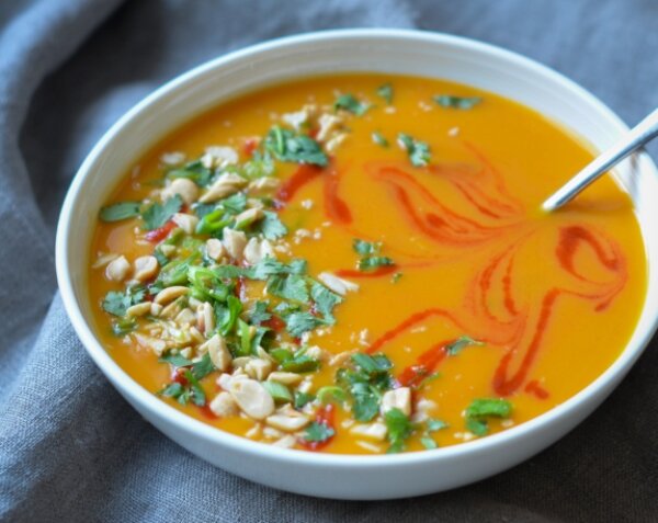 Суп пюре из тыквы пригодится вам, если вы устали от обилия мясных блюд на праздники и хотите немного легкой, полезной еды. Если это так, то у меня есть простой овощной рецепт для вас. Это суп пюре из тыквы со сливками (или молоком), а также с добавлением специй, чеснока, зеленого лука и кинзы. Это успокаивающее, ароматное блюдо, а пряные специи (карри с имбирем) действуют согревающее. Для улучшения текстуры можно бросить в тарелку горсточку слегка поджаренного арахиса или тыквенных семечек, хотя это не обязательно. Но я люблю яркие ароматы и текстуры – и как они выглядят тоже. Мне этого супа достаточно для полноценного обеда, тем более что я подаю к нему свежеиспеченный хлеб с маслом. Но если для вас он недостаточно сытный, не стесняйтесь добавить в кастрюлю пару ложек риса – для густоты и сытности. Ингредиенты: 1 кг тыквы без кожуры; 2-3 ст. ложки растительного масла; 2 средних луковицы; 3 зубчика чеснока; 2 ст. ложки крупно нарезанного свежего имбиря; 3 средние морковки; 1,25 л (5