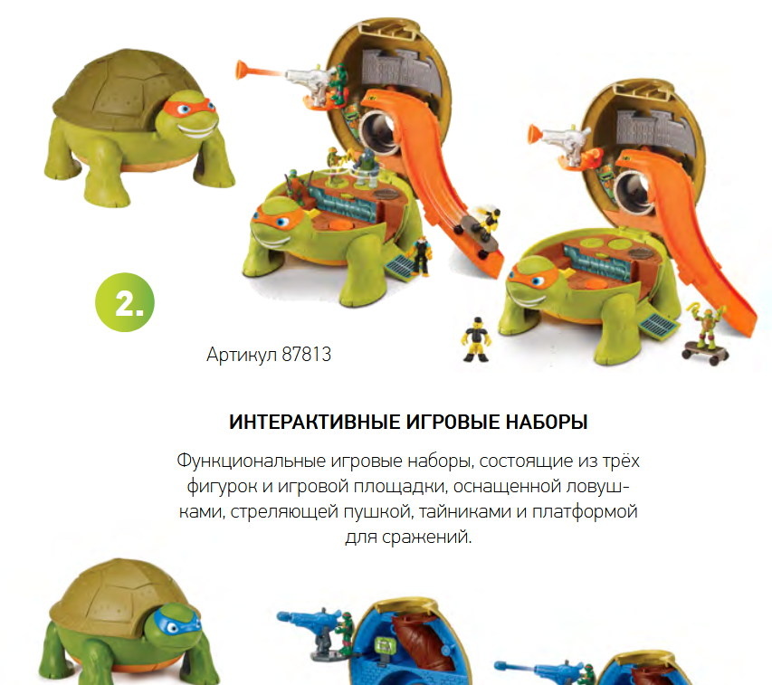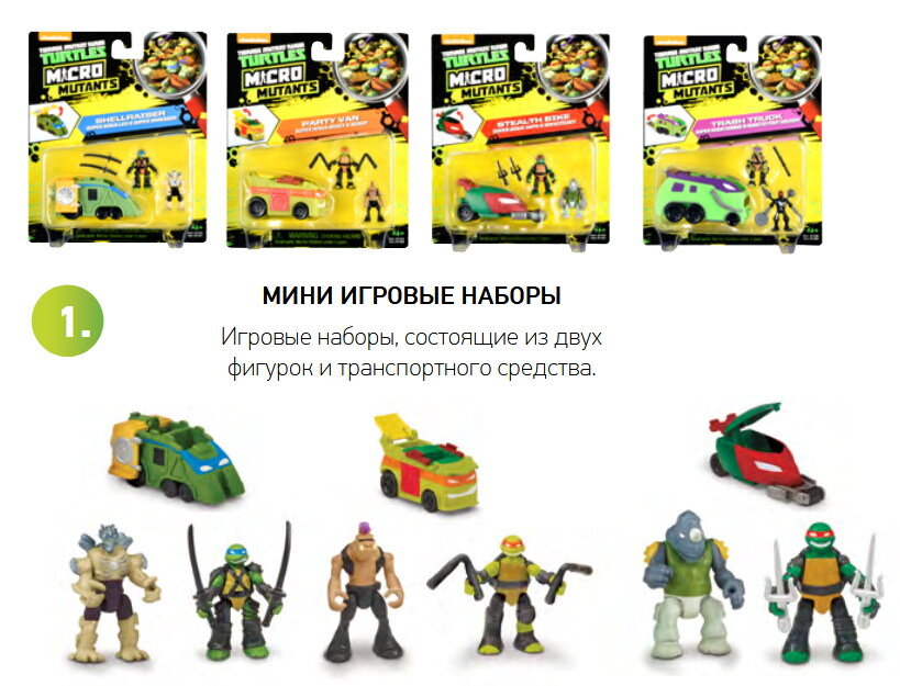 Уникальные в своем роде игрушки теперь уменьшены до размеров игры на ладони, при этом сохранив весь функционал классических фигурок. Это НОВАЯ категория в игрушках от бренда TMNT – «Черепашки-ниндзя» – MICRO! В новой категории уже сейчас имеются три ассортиментных ветви: МИНИ ИГРОВЫЕ НАБОРЫ Игровые наборы, состоящие из двух фигурок и транспортного средства. ИНТЕРАКТИВНЫЕ ИГРОВЫЕ НАБОРЫ Функциональные игровые наборы, состоящие из трёх фигурок и игровой площадки, оснащенной ловушками, стреляющей пушкой, тайниками и платформой для сражений. МНОГОФУНКЦИОНАЛЬНЫЕ ИНТЕРАКТИВНЫЕ ИГРОВЫЕ НАБОРЫ В наборе более 20 разных интерактивных игровых элементов. Набор компактен в собранном виде и схож по размеру и по виду с фигурками классического размера 28 см (лишь немного меньше) – прекрасно вольётся в коллекцию. Возраст 4+. Источник: https://www.toybytoy.com/war_toy/Teenage-mutant-ninja-turtles-MICRO-now