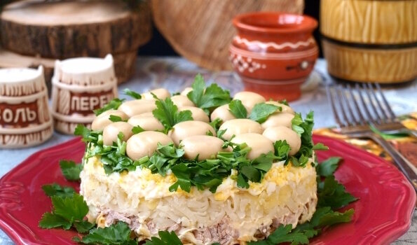 Вариант вкусного и красивого салата "Полянка" для разнообразия вашего меню. ИНГРЕДИЕНТЫ Шампиньоны маринованные - 120 г