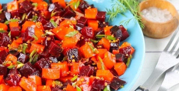Масло растительное - 0,5 ч.л. ПРОЦЕСС ПРИГОТОВЛЕНИЯ Салат из вареной свеклы и моркови можно подавать хоть каждый день, особенно во время Поста, только внося или убавляя некоторые ингредиенты, заменяя зеленый лук репчатым или маринованным, горчицу в зернах другими соусами и т.д. Готовится блюдо всего лишь за 5-10 минут, если вы заранее отварили морковь и свеклу в горячей воде около 20-25 минут, а затем резко остудили в ледяной воде и счистили кожуру. Если вы готовите салат на большее количество человек, то увеличьте количество ингредиентов. Салат из вареной свеклы и морковки можно подать даже на ужин - он не калориен и не испортит фигуру, потому что состоит из одних овощей! Тем, кто любит пикантные вкусы, рекомендуем добавить при создании салата зубчик