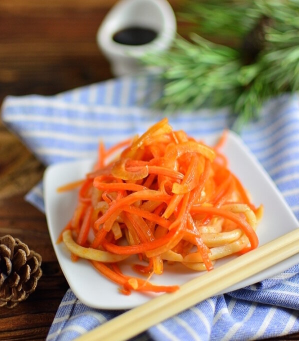 Хе из кальмара с морковью и соевым соусом по-корейски. Необычное блюдо для особенных случаев! Или на каждый день, если вся ваша жизнь такая. ИНГРЕДИЕНТЫ Кальмар (очищенный) - 70 г