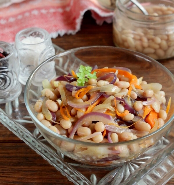 Растительное масло - 1-2 ст.л. ПРОЦЕСС ПРИГОТОВЛЕНИЯ Для постного рациона и любителям бобовых предлагаю рецепт простого и вкусного салата с консервированной фасолью, морковью и луком. Возьмите продукты по указанному списку. Жидкость, в которой находились бобовые, сливаем. Шинкуем лук (можно два цвета) и морковь, измельчаем зубок чеснока. В рафинированном масле пару минут пассеруем луковую нарезку с чесноком. Добавляем морковную соломку. Перемешиваем и около 5 минут томим до размягчения. Смешиваем с фасолью, солим, перчим по вкусу. Салат с консервированной фасолью, морковью и луком готов. Подаем теплым или остуженным. Приятного аппетита!
