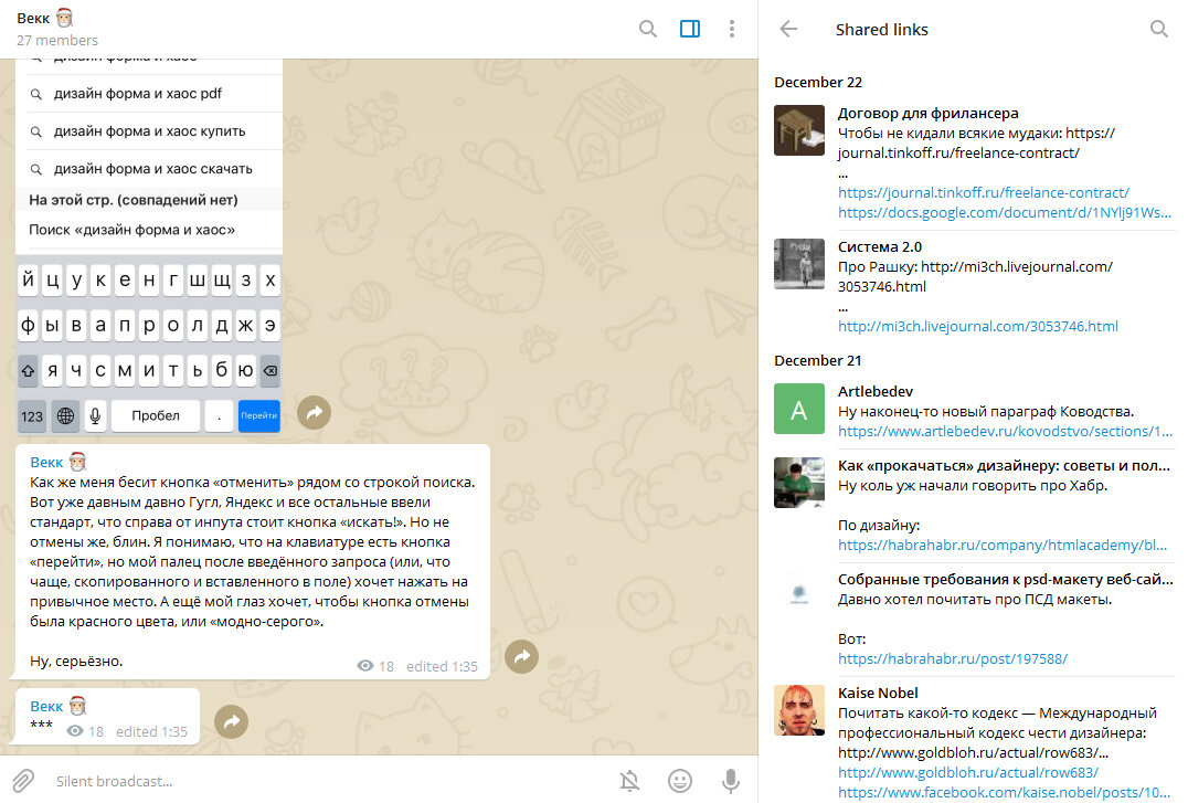 Каждый день я трачу не менее, но как показала практика, более часа на прочтение полезностей. К познавательному материалу не относятся блоги авторов, пинтересты, всякие паблики по дизайну и прочие источники. В учебный час нужно читать что-то действительно важное, а не только интересное. Рекомендую создать себе канал в телеграме и кидать все полезное. У меня это выглядит вот так: