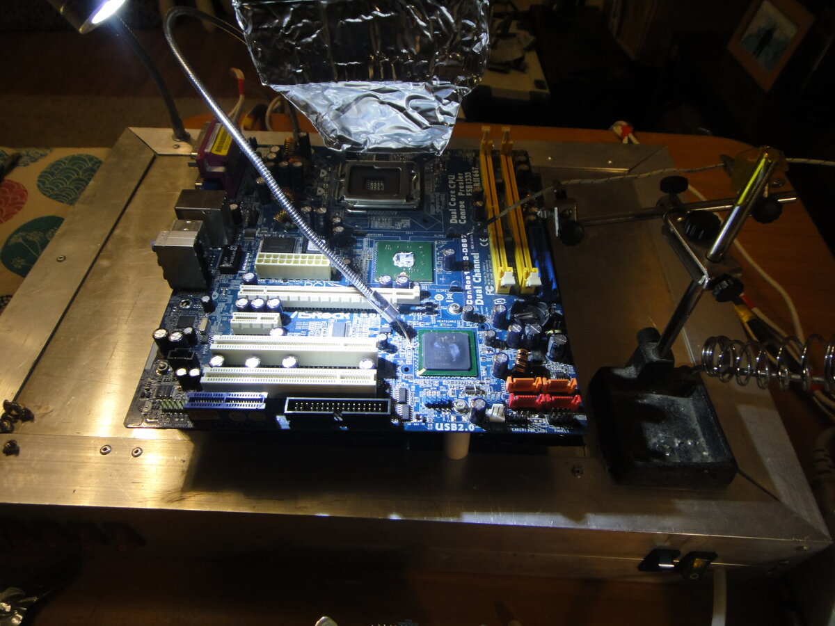 Материнская плата пришла с жалобами, что не работает ни один USB-порт и PS/2, управление клавиатурой и мышью невозможно. Линии D+ D- пробиты. Принято решение менять микросхему южного моста NH82801GB. Использовалась инфракрасная паяльная станция со стабилизацией температуры нижнего нагревателя и нагревом по термопрофилю верхним нагревателем непосредственно зоны пайки. Плата до начала работ. Установлена на стойки и размещена на паяльной станции. Датчик на гибком штативе в зоне паяемого чипа, второй датчик контролирует работу нижнего нагревателя. 1-й этап - выпайка неисправного чипа. Непосредственно пациент. Фольгой укрываем элементы и пластик разъемов вокруг паяемого чипа. Чтобы обеспечить лучший термоконтакт, датчик находится в капле белой термопасты. Приступаем к пайке. Включаем станцию. Устанавливаем температуру нижнего подогрева в 130 градусов, работа по термопрофилю для бессвинцовой пайки. Максимальная температура термопрофиля 225 градусов. Нагрев платы включен. Преднагрев платы
