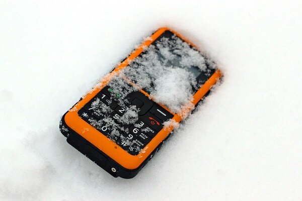 3. Внешний вид и материалы (пластик и резина). Телефон очень приятно держать в руках: лежит как влитой. На боковых гранях есть поперечные канавки для лучшего хвата. В перчатках и варежках мимо кнопок вы тоже не промахнетесь. Оранжевая окантовка экрана и клавиатуры поможет издалека увидеть телефон, если вы его где-нибудь потеряете.