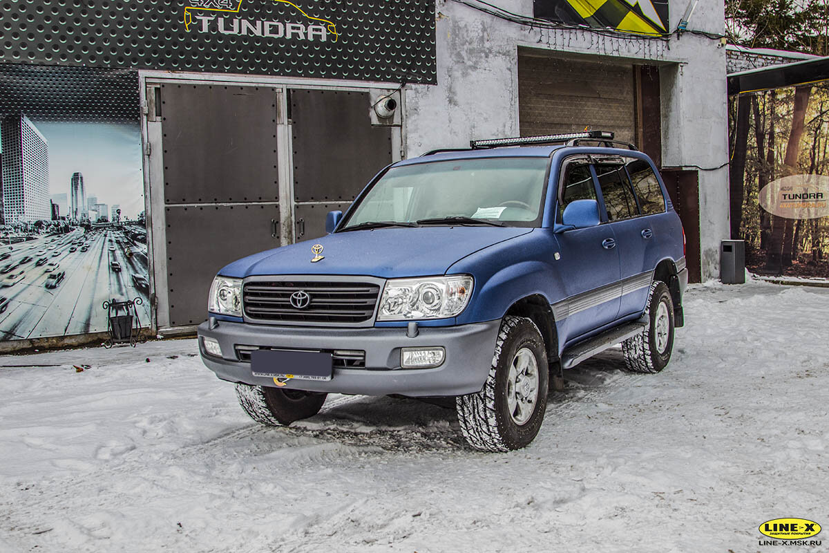 Toyota Land Cruiser во всем мире, наряду с Land Rover Defender является желанным трофеем для любителей бездорожья. Land Cruiser 100, к тому же, один из популярных вариантов при выборе. Сочетая в себе проходимость, комфорт и надежность, он для многих является той самой синицей в руках, а для остальных - журавлем в небе, к которому хочется стремиться. Поиск хорошего, "живого", варианта Toyota Land Cruiser 100 - сродни миссии Индианы Джонса по розыску Святого Грааля - сутки напролет будущие владельцы, их помощники, дети, жены и родители мониторят автомобильные сайты, форумы и ресурсы объявлений, лишь бы не упустить хороший вариант. И здесь уже не обсуждается цвет кузова, салона, иногда даже состояние кузова - все поправимо и исправимо. Главное - чтобы ездил. Владельцу этого крузака повезло - решение технических проблем ограничилось ТО и заменой расходников. С кузовом было сложнее. У нас в центре защитных покрытий LINE-X он оказался неспроста - ранее он был покрыт какой-то резиновой пле