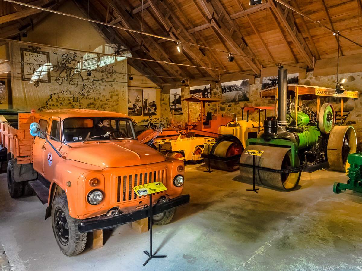 Автомузеев в бывшем СССР немало, и этот - один из самых интересных, как по коллекции, так и по расположению. Экспозиция музея размещена в замке вассала Ливонского ордена Шлокенбека в 60 км от Риги близ города Тукумс. Замок примечателен тем, что это единственная в Прибалтике сохранившаяся усадьба-крепость 16-17 веков. Уютный внутренний двор и постройки усадьбы стали местом расположения наиболее крупных экспонатов Латвийского дорожного музея. 11-ти тонный трактор-бульдозер ЧТЗ Т-100 с отвалом. Такие перестали выпускать в восьмидесятых. Установленный прицепной решетчатый каток предназначен для уплотнения насыпи, отсыпаемой мерзлыми грунтами. внутренней полости барабана в виде конуса заполнена бетоном. Сзади видны отсеки для грузов (массой до 25т). По соседству - английский каток Wallis and Steevens Advance середины прошлого века. Все экспонаты можно трогать руками, поэтому я долго ждал момента, когда на технике не будет толп детишек. Кулачный каток, на заднем плане винтажные каменные ка