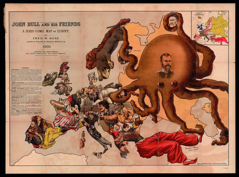 В картографии образ осьминога впервые появился на британской карте 1877 года за авторством художника Фреда Роуза. На военной карте он изобразил Россию в качестве чудовищного серого осьминога, который претендует на определённые территории. С этих пор, когда необходимо было рассказать о политической обстановке в мире, картографы неоднократно прибегали к использованию этого образа.