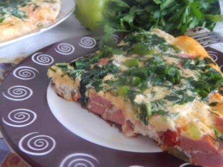 Яичница-глазунья, белковый омлет, яйца «вкрутую» или «в мешочек» — все эти блюда мы знаем и любим с детства. Но почему бы не попробовать внести разнообразие в привычное блюдо, сделав его, по сути, новым и оригинальным? Омлет с помидорами, сыром и овощами — как раз тот случай. А еще можете приготовить картофель со сливками и сыром в духовке — отличный завтрак или сытный обед для всего семейства. Время на приготовление омлета-ассорти – 30 минут. Количество порций-3 Ингредиенты: Как приготовить омлет с сыром и овощами на сковороде: Для начала подготовим все продукты, которые будут принимать участие в приготовлении омлета. Отмерим половину стакана молока, несколько сосисок и свежих куриных яиц, зелень, овощи, отрежем кусочек сливочного масла и твердого сыра. Также нам понадобится сладкий перец (или болгарский перец). Его мы разрезаем пополам, очищаем от семечек и плодоножки, промываем, и нарезаем тоненькой соломкой. Несколько веточек любой свежей зелени моем под проточной водой. Затем ст