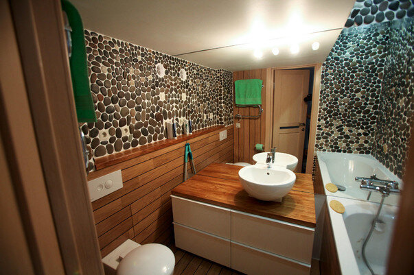 Совмещённый санузел с ванной с использованием гладкой морской гальки вместо плитки и деревянных элементов. Совмещённый санузел с ванной на небольшой площади может быть по-настоящему стильным и уютным. Для этого стоит лишь заменить в оформлении стен привычную плитку на крупную морскую гальку. Кроме необычной эстетики, такой дизайн отличается еще и практичностью, удобством в уходе. Сама ванная, унитаз и раковина белого цвета, без лишних деталей, перегружающих интерьер. Небольшую площадь совмещенного санузла визуально увеличивает зеркало во всю стену, где установлена раковина. Остальные стены, полы, столешница тумбы под раковину и входная дверь выполнены из материалов под дерево. Подробнее о проекте на сайте 4living.ru Статьи на тему: 1. 20 проектов «камень в интерьере» 2. Ванная комната с управляемым освещением: дизайнер Иван Юрыма 3. Ванная в черном цвете: дизайнер Майя Васягина