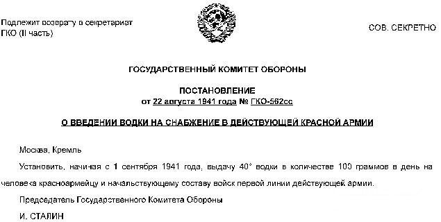 1. Постановление ГКО № 562 от 22.08.1941 г. «О введении водки на снабжение в действующей Красной Армии»