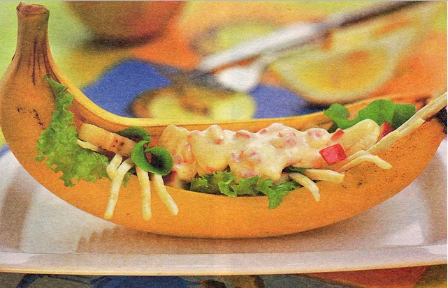 Продукты: 1 красное яблоко, 80 г. корня сельдерея, 1 помидор, 4 листа салата, 2 ст. л. майонеза или несладкого йогурта, немного лимонного сока и 2 банана. Как приготовить: Бананы тщательно вымыть, вытереть насухо и оставить в прохладном месте на 15-20 минут. Острым ножом разрезать кожуру банана вдоль и очень осторожно вынуть мякоть так, чтобы кожура сохранила форму. Положить кожуру в прохладное место. Мякоть разрезать вдоль пополам и нарезать неширокими ломтиками. Яблоко нарезать небольшими кубиками. Корень сельдерея вымыть, очистить и нарезать тонкой соломкой. Листья салата тщательно вымыть и нарвать на длинные полоски. Чтобы бананы, яблоки и корень сельдерея не потемнели, сразу после нарезки сбрызнуть лимонным соком. С помидора снять кожицу, удалить семена, а мякоть нарезать очень мелкими кубиками и смешать с майонезом ( или несладким йогуртом, чтобы соус получился более легким). Бананы, яблоки и корень сельдерея перемешать и заправить подготовленным соусом. В кожуру банана вло